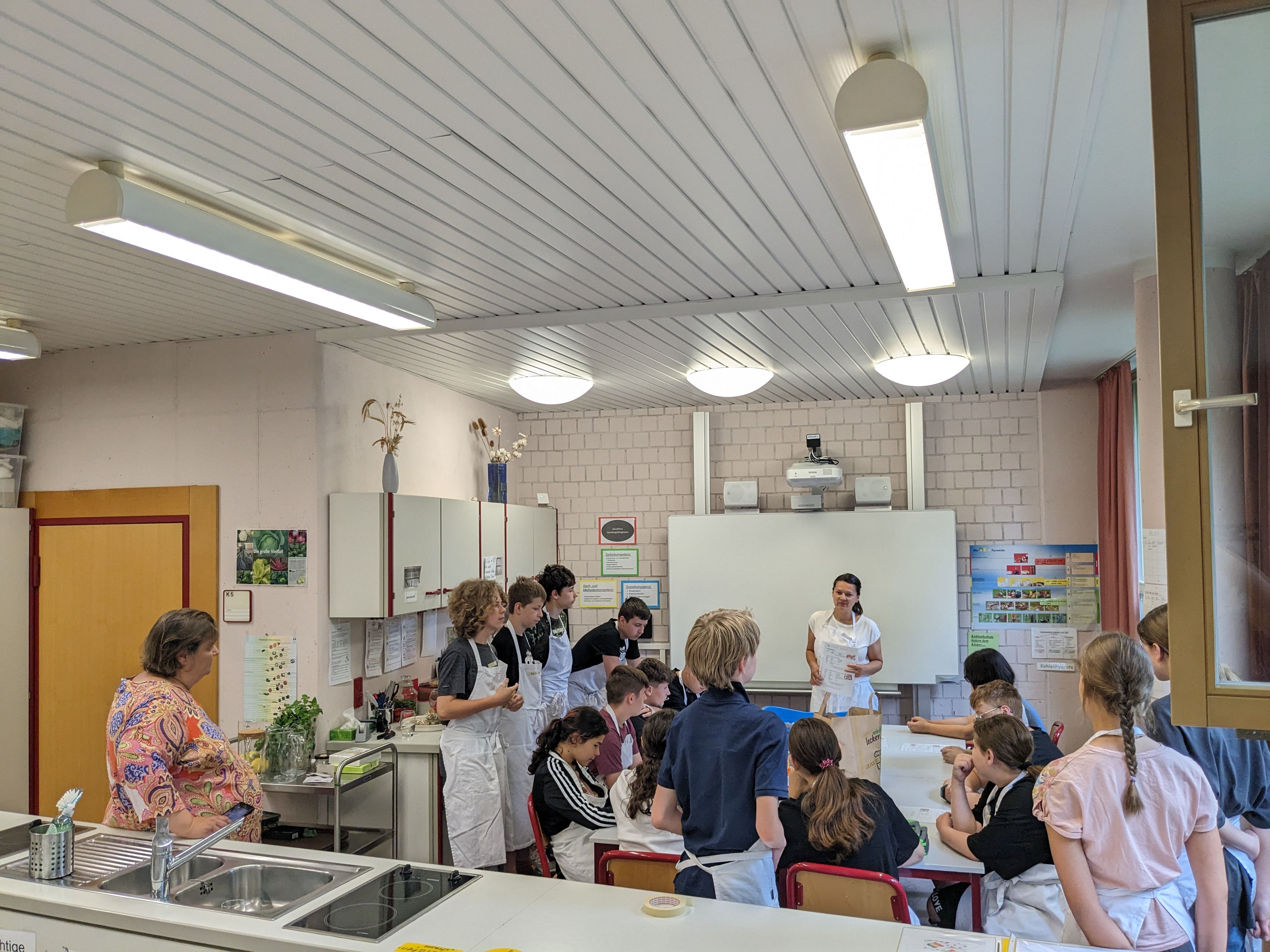 Die Oskar-Sembach-Realschule ist keine 500m Luftlinie entfernt und wir freuen uns, dass wir ein Kooperationsprojekt im Schuljahr 2022/23 starten konnten, das wir auch im laufenden Schuljahr fortsetzen. Zum gemeinsamen Unterricht im Fach Ernährung und Soziales lud die Klasse 6c von Ulrike Schmidt die 7. Klasse von Anja Reusch zum Frühstück ein. Die Arbeit wurde gerecht verteilt. Die Realschüler*innen brachten Rezepte und Zutaten für Obstspieße und Pizzabrötchen mit, wir hatten schon die Stunde zuvor Knuspermüsli und Minze Sirup hergestellt. Zusätzlich gab es noch Tomaten-Mozzarella-Spieße. Vanessa Münch und Michael Winkler unterstützten beim Aufbauen des Buffets und halfen mit beim Eindecken der Tische. Das war für alle eine schöne Erfahrung!