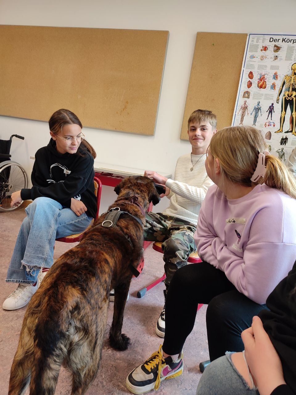 Der Schulhund Lui war zweimal in der Klasse 6b zu Besuch. Die Hundeführerin Michaela Breunig stellte den Schülerinnen und Schülern ihren Hund vor und erklärte, wie man mit ihm umgehen soll, wie man ihn am besten streichelt, was er mag und was er nicht mag.
