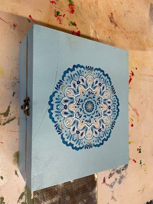Wer an Tag 2 nicht ganz fertig wurde, hatte jetzt die Gelegenheit, sein Projekt noch zu Ende zu gestalten. Im Anschluss versiegelten wir die Designs mit Klarlack und befreiten die Beschläge der Kisten von Farbe und Klebebandresten. Eine Schülerin hatte die tolle Idee, eine Lampe aus ihrer Box zu machen. Diese befestigten wir.