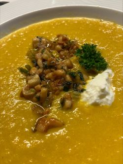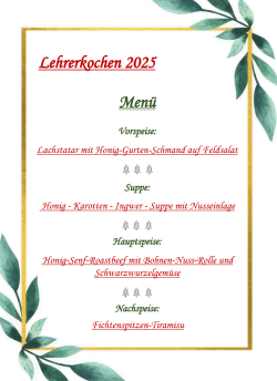 Immer höhere Ziele steckte sich die rgs beim gemeinsamen Lehrerkochen. Diesmal war es ein viergängiges Menü, das in vier Gruppen von zwölf Lehrkräften zubereitet wurde. Matthias Brückner stellte eine anspruchsvolle Auswahl an Speisen zusammen. Als Vorspeise gab es ein Lachstartar mit Honig-Gurken-Schmand auf Feldsalat. Es folgte eine Honig-Karotten-Ingwer-Suppe mit Nusseinlage. Eine Gruppe bereitete über mehrere Stunden die Hauptspeise zu– ein Honig-Senf-Roastbeef mit Bohnen-Nuss-Rolle und Schwarzwurzelgemüse. Zum Nachtisch gab es ein Fichtenspitzen-Tiramisu. Mehrere Stunden wurde gekocht und am Ende standen hervorragende Leckereien auf dem Tisch. Nicht nur dank des herrlichen Essens war es ein unvergesslicher Abend!