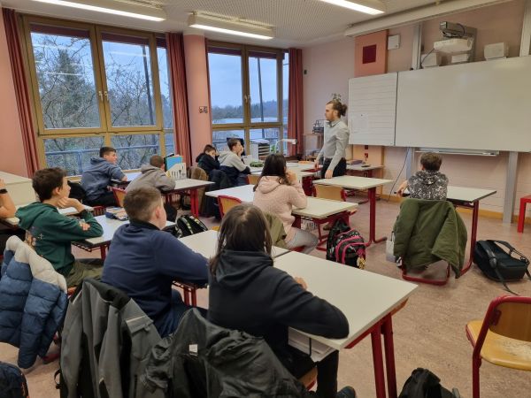 Johannes Hochradel von der Polizeidienststelle Lauf war in der 7a und 7b zu Besuch und sprach mit den Schülerinnen und Schülern über das Thema Gewaltprävention. Er warnte die Jugendlichen davor, in WhatsApp-Gruppen andere Menschen zu beleidigen, da sonst das Handy als Tatwaffe betrachtet und von der Polizei eingezogen werden kann. Der Polizist erarbeitete mit den zwei Klassen einige Strategien, die dabei helfen, niemals eine Straftat zu begehen. Zum Beispiel sollten bestimmte Posts nicht geteilt, sondern den eigenen Eltern und der Polizei gemeldet werden („Report statt Repost“). Nach seinem Besuch waren alle sehr beeindruckt und überlegten gemeinsam, wie sie künftig mit dem Thema Gewalt umgehen möchten.