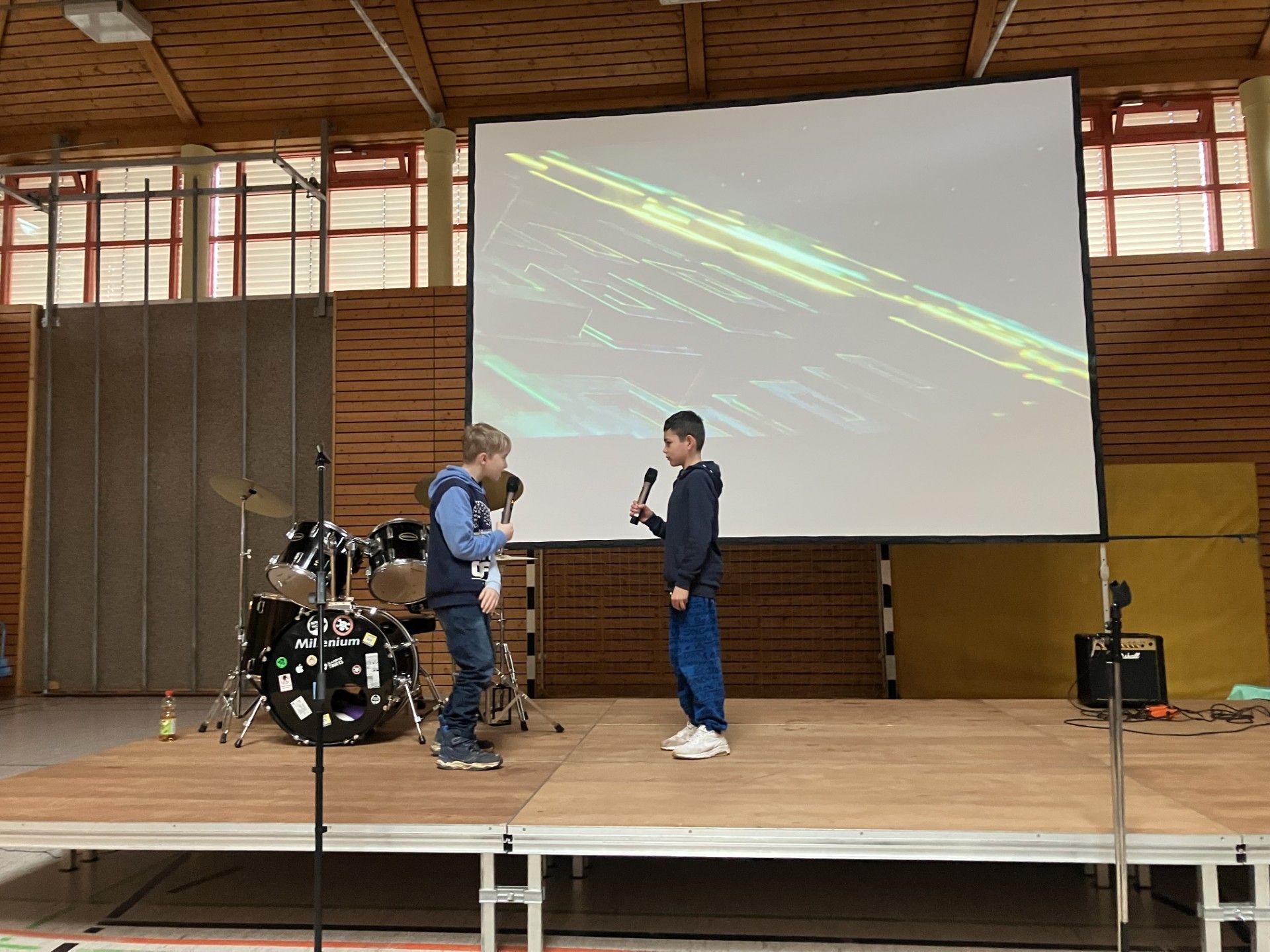 Vor einer beeindruckenden Kulisse nahmen ca. 220 Schülerinnen und Schüler Platz. Unter einer riesigen Leinwand mit Logo, gemalt von Eva und Sara Bruckner (8b), war eine große Bühne mit Schlagzeug, Notenständern, Mikrofonen und Klavier aufgebaut. Dort zeigten 15 Kinder und Jugendliche und eine Klasse in den folgenden 50 Minuten ihre vielseitigen Begabungen. Nach der Show wurden die Teilnehmenden unter tosendem Applaus mit Preisen und Gutscheinen ausgezeichnet und alle gingen voller neuer Eindrücke und einem geänderten Blick auf ihre Mitschülerinnen und Mitschüler zurück in ihre Klassen.
